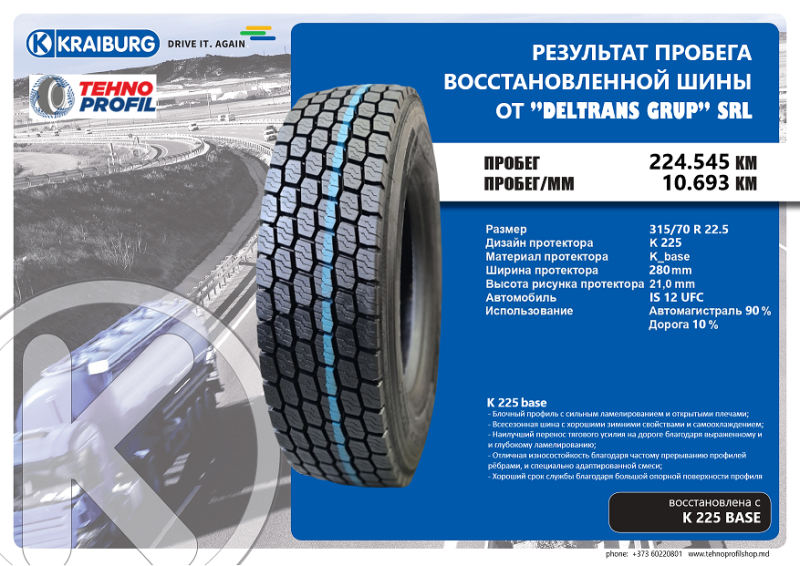 24 декабря 2020 года шины 315/70R22,5 были восстановлены каркасы шин Michelin на премиум протекторе K225_base шириной 280 мм. При монтаже данных восстановленных шин, в декабре 2020 года, на грузовик с рег. ном. IS 12 UFC, были зафиксированы показания спидометра, составляющие на тот момент 285 055 км. По состоянию на 01.02.2023, спустя 2 года, данные шины износились и показания спидометра составили 509600 км. Таким образом, данные шины "пробежали" 224 545 км.